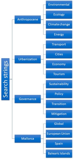 We conducted a review of selected works from the available literature. This is not intended as an exhaustive review of the literature but a selection of studies that support the theme of this investigation. After the joint deliberation of the authors and based on the primary aim of the research, the following main categories were established for the literature search: Anthropocene, climate change, governance, and Mallorca. These categories were combined as keywords from the conceptual area of the research were selected, attempting to combine several of them in search of the databases of Web of Science, Scopus, and Google Scholar. Figure 1 shows a prisma flow chart for the search strings.