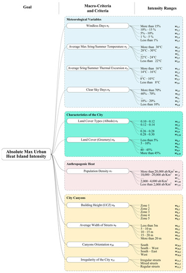 18]. Indeed, the proposed criteria have been selected from a thorough review of the literature. In addition, to verify that all selected criteria should be used, the linear correlation among criteria and the absolute max UHII is evaluated (exploiting data surveyed in 41 urban districts of the European continent). Moreover, the index