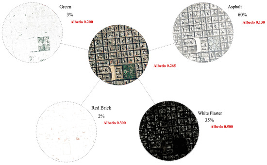 18]. Such image analysis breaks down the satellite image to individuate urban district materials (asphalt, water, white plaster, red brick, etc.) and the presence of greenery (the analysis is specifically calibrated for the application of the