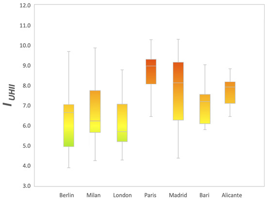 Figure 6 shows the boxplot of the UHII evaluated for the compared cities. The boxes represent the distribution of the UHII, and the black horizontal line inside the boxes denotes the median of the sample. Although the box contains all results within the 25th and 75th percentile of the population, the vertical line contains all results that are not considered outliers. In all the compared city, temperatures in the central districts are higher than the surrounding areas as is predictable and widely known in the literature [