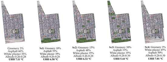 In order to demonstrate the potential of the method and provide a useful overview of different mitigation strategies, four scenarios of intervention within the central district of “Murattiano” have been assessed and consist of an increase in greenery (Sc1, Sc2, Sc3) and the use of cool roofs (Sc4) (