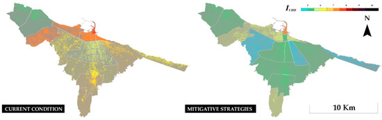Figure 8 shows the intensity map of the city of Bari in the case of an increase in greenery according to the available space of every district (as shown in the case of Murattiano, with a maximum greenery of up to 30%).