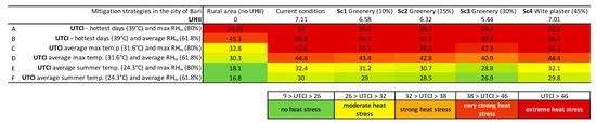 It is worth noting that by investigating all these combinations, it is possible to provide a good overview of the effect of the UHII on the heat stress in the “Mutattiano” district of Bari. Indeed, case A concerns the unlikely combination between the hottest day and the most humid day of the summer. The heat stress evaluated in B and C regards human discomfort when either the temperature or humidity is higher in the summer. Case D represents a common day of summer in the hottest hours with average values of RH. Finally, cases E and F estimated the heat stress in the average daily summer temperature (considering different RH).