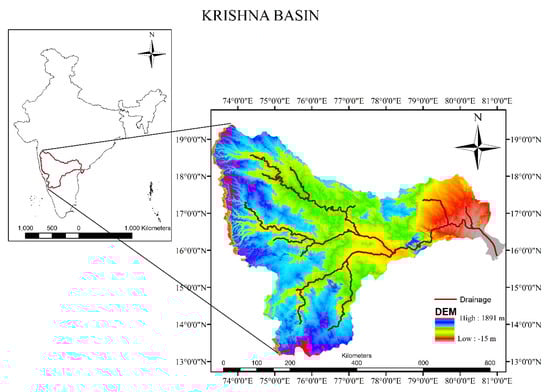 The River Krishna basin is one of the longest rivers in central southern India, with a total surface area of 258,948 sq. km. The basin is located between 13°10′ to 19°22′ North latitudes and 73°17′ to 81°9′ East longitudes, as shown in Figure 1. It covers four Indian states: Karnataka (43.8%), Andhra Pradesh and Telangana (29.81% together), and Maharashtra (26.36%). The river has several tributaries, with Ghatprabha, Malprabha, and Tungabadhra joining on the right and Bhima, Musi, and Munneru joining on the left. The Krishna basin is divided into seven subbasins: Bhima Upper, Bhima Lower, Krishna Upper, Krishna Middle, Krishna Lower, Tungabadhra Upper, and Tungabadhra Lower.