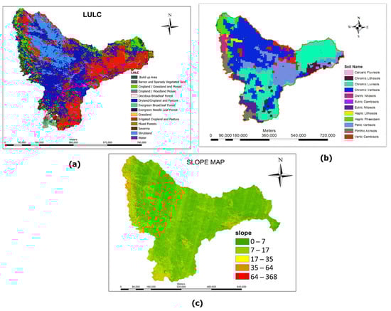 Missing values are contributed by the streamflow data obtained from hydrometeorological stations. Due to missing stream flow data at many stations, only 14 out of 47 stations’ data were used for calibration and validation of the model. Land use information for the Krishna basin is divided into 14 categories, as shown in Figure 2a, with Agriculture (72.56%) the most important. Figure 2b represents a soil map dominated by fine-textured soil. Laterite and lateritic soils, red soils, alluvium, black soils, mixed soils (red and black, red and yellow, etc.), and alkaline and saline soils are the important soil types found in the basin. A slope map with a maximum of 5 classes based on the percentage rise was generated using DEM, as shown in Figure 2c.