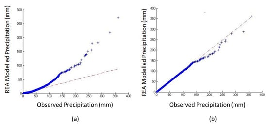 Quantile–Quantile (QQ) map of observed vs. REA modelled precipitation data (a) Before bias correction (b) After bias correction.