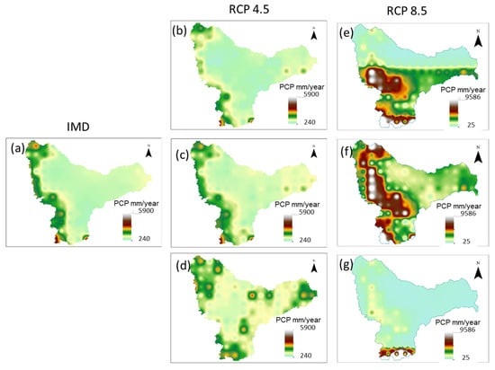 Annual average precipitation variation in the Krishna basin for (a) Historic, Future1 (b,e), Future2 (c,f), and Future3 (d,g) periods under RCP 4.5 and RCP 8.5 scenarios.
