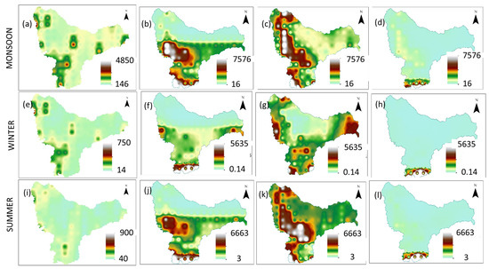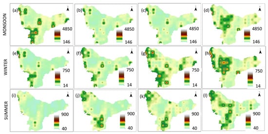 The annual average variations of precipitation show an increase in the western part of the basin in Future1 and a decrease in the Future2 period under RCP 4.5. Under RCP 8.5, annual average precipitation decreases by 36% in Future1, 10% in Future2, and 60% in Future3. However, Mishra and Lilhare (2016) [11] projected a continuous increasing trend of water balance components, along with rainfall and air temperature, in both the RCP 4.5 and 8.5 scenarios of CMIP5 models in the Krishna River basin. Rainfall increases approximately 8–20% under RCP 4.5 and 10–40% in the case of RCP 8.5 by the end century. Similarly, the surface runoff, streamflow, and ET were projected to increase of approximately 20–55%, 20–60%, and 4–9% under RCP 4.5 and 35–120%, 40–120%, and 2–8% in the case of RCP 8.5 by the end of the century. Tirupathi et al. (2018) [52] projected a decrease in rainfall under future scenarios for different climate models. In the present study, daily minimum and maximum temperatures within the basin show higher values in the Future periods as compared to the Historic period under both scenarios. The Future2 period has higher temperature values than the other two future periods. Figure 5 and Figure 6 depicts seasonal variations of precipitation, i.e., monsoon (June–September), winter (October–January), and summer (February–May), for the RCP 4.5 and 8.5 scenarios.