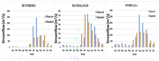 Comparisons of the observed mean monthly streamflow and those produced by SWAT using REA data at three gauge stations (Figure 7)—i.e., the Huvinhedgi outlet of the Upper Bhima, Lower Bhima and Upper Krishna; the Mantralayam outlet of the Upper and Lower Tungabadhra; and the Pondhugala outlet of the Krishna River basin. The observed streamflow in July and August is more variable than the simulated streamflow at Huvinhedgi, whereas the model projects similar streamflow at Mantralayam in months other than June and July. The Pondhugala, downstream of the Huvinhedgi and Mantralayam, shows a similar pattern in mean monthly streamflow, with maximum flows in August, September, and October. The errors in the mean monthly streamflow may be due to the failure to account for reservoirs and changes in land use in the Krishna River basin.