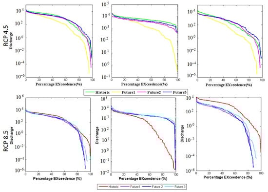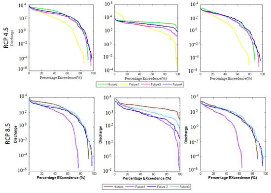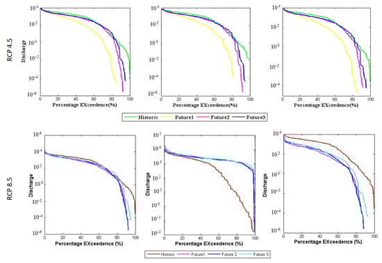 According to the climate projections, lower streamflows are simulated for the future periods. Flow Duration Curves (FDCs) at three gauge stations—Huvinhedgi (Figure 8), Mantralayam (Figure 9), and Pondhugala (Figure 10)—are used to explain the relationship between the magnitude and frequency of streamflow for the future periods. These curves enumerate the flow of exceedance for a given level of probability developed on an annual, monsoon, and non-monsoon basis, assisting water managers in determining water availability in the face of climate change. Figure 8 depicts the FDC of the Huvinhedgi gauge station, representing total flows upstream of the basin, which demonstrates an overall decrease in flows during the Future1 period, with flows during theFuture2 and Future3 periods comparable to the historic period. Though Future2 and Future3 project an increase in precipitation for the basin, there is a decrease in high flows (flows that exceed 10–30% of time) and low flows are (flows that exceed 80% of time), which is mainly due to a likely increase in temperatures. The median flows (flows that exceed 30–70% of time) are similar to the Historic period flows. Both scenarios project similar patterns of curves with changes in quantity, with RCP 4.5 projecting comparatively fewer quantities than RCP 8.5.