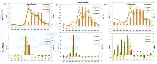 The relative change in streamflow suggests that streamflow decreases throughout the year, with an increase in June for the three gauge stations. Figure 11 shows mean monthly flow as a ratio of the mean annual flow for the historic and future periods at Huvinhedgi, Mantralayam, and Pondhugala (top: absolute values, bottom: relative change).