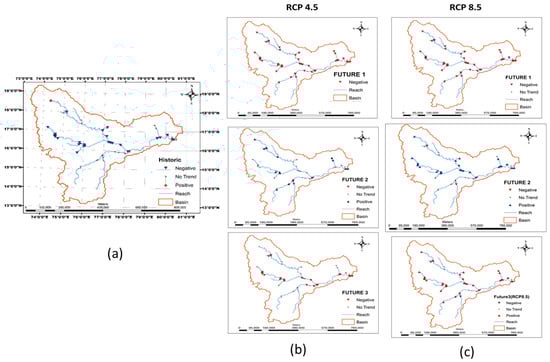 Annual streamflow trends (a) historic, (b) RCP 4.5 scenario, (c) RCP 8.5 scenario.