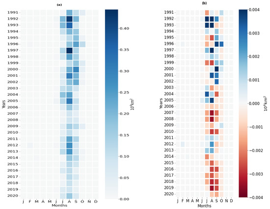 Figure 2 shows the Hovmöller diagrams of the monthly cooling surface (Figure 2a) and the monthly anomaly diagram (Figure 2b) of the cooling surface (CUS) at the northern coast of the Gulf of Guinea. This figure is performed for the defined area (10° W–10° E; 2° N–6° N), by spatially averaging the CUS. Then, the anomalies are computed for every month by differentiating the value of its CUS by the climatology of that month. The largest cooling areas (>0.30 × 106 km2) are observed during the 1991–2005 period, and particularly during August which represents the core of the major upwelling season in this area (see Figure 2a). Figure 2b shows that at the northern coast of the Gulf of Guinea, the upwelling season occurs generally from July to September, with extension in June and October some years. The CUS alternates between decreasing and increasing during 1991–2005. From 2006 up to 2020, there is a persistent decrease in the CUS, which could indicate a warming at the northern coast of the Gulf of Guinea.
