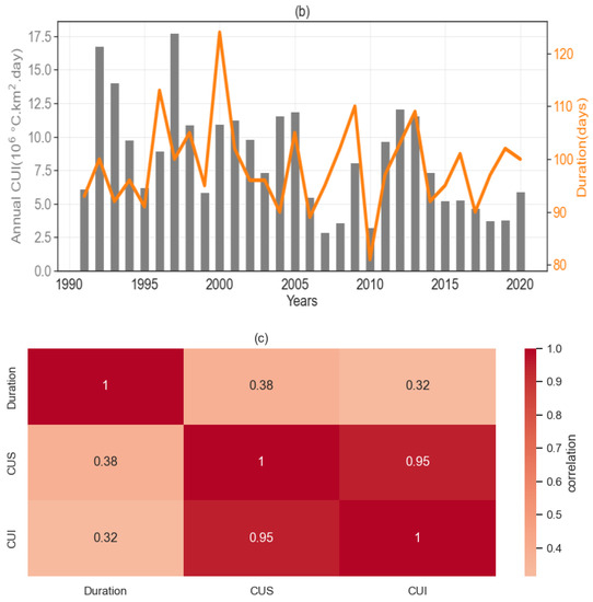 (a) Longitude–time diagram of the cooling surface at the northern coast of the Gulf of Guinea, (b) annual evolution of the index and duration of coastal upwelling, (c) and correlogram between the characteristic upwelling parameters. The numbers inside the correlogram represent the correlation coefficients and are proportional to the colors.