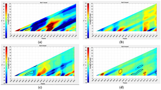 For Eof1 (Figure 6a), there is no long-term trend break above 10 years for this structure, even if for time segments above this period the trend remains negative. A significant negative trend is observed from 2013 to 2020, with time segments ranging from 3 to 10 years. There are significant positive 3-year and 6-year trends between 2011 and 2012. The Eof2 graph (Figure 6b) presents significant negative trends in 2004–2006 for a time segment of 3–5 years, in 2013 for a time segment of 3 years and 6 years, and in 2016 for a time segment of 8 years. The only significant positive trend is observed in 2015 for a 3-year time segment. In the case of Eof3 (Figure 6c), a significant negative trend is observed in 2018 for a time segment of 3 years. The latter concerns Eof4 (Figure 6d) for which the time segments range between 3 and 8 years. It shows significant positive trends in 2002, 2008, and 2016, and significant negative trends in 2012–2015 and 2020.
