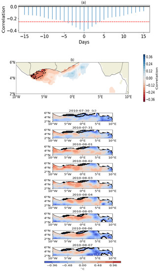 (a) Lag correlation between the upwelling surface and MHWs from May to October in the northern Gulf of Guinea. The dashed red horizontal line represents a 99% significance. (b) Correlation map determined at 99% significance (dashed line) between upwelling surface and MHWs from 1 May to 31 October. (c) Example of the evolution of the SST anomaly and the cooling surface from 31 July to 6 August 2010.