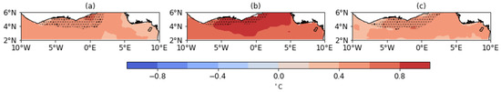 Figure 8 depicts SST and CUS composites 6 days before (Figure 8a), during (Figure 8b), and 6 days after (Figure 8c) the MHW events. Weak positive SST anomalies (>0.38 °C) are observed prior to MHW events off the Gulf of Guinea (Figure 8a). Along Cape Three Points, a strong warming (>0.4 °C) is noticed at 5° N; 0° E. That surface warming later intensifies during MHW events (>1 °C) by spreading longitudinally between 5° W and 5° E, and latitudinally between 3° N and 6° N (Figure 8b). By the end of the MHW events (Figure 8c), the surface warming decreases significantly (<0.3 °C). This pattern of SST anomalies is characterized by a weak spatial extension of upwelling surface before and during MHW events, whereas it increases at the end.