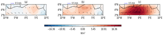 LH anomaly composites (Figure 9) indicate weak evaporation, marked by positive values between 0 and 7 W·m−2 before the events onset (Figure 9a). These values are located in the eastern part of the study area and lie between 2.5° N and 5° N. This weak evaporation is corroborated by wind anomalies which are almost null along the coast at 4° N or are directed offshore at 3° N. This wind anomaly pattern does not allow for any moisture transport to the continent. During the MHW events (Figure 9b), an excess of evaporation is noticeable in the eastern part of the study area. Positive LH anomalies (>7 W·m−2) are observed around Cape Three Points where positive SST anomalies were previously registered during the occurrence of MHW events. Finally, an increase in excess of evaporation (>14 W·m−2) is observed at the end of the MHW events (Figure 9c). These LH anomalies are almost two times those observed during MHW events. Similarly, they are located in the same region (5° W–5° E, 3° N–6° N) where a large surface warming of the SST was observed. The related wind anomalies’ structure shows vectors almost oriented toward the shoreline, which could reflect an oceanic moisture input on the continent.