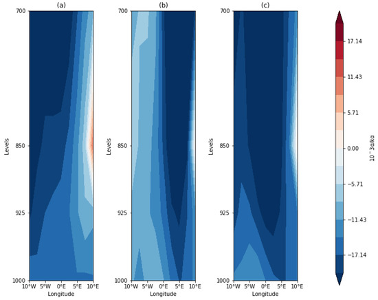 Figure 10 depicts altitude–longitude composite diagrams of vertical velocity (in 10−2 Pa·s−1) averaged over 2° N–6° N along 10° W–10° E. Negative values indicate an upward motion of air, which can carry moisture from the ocean to the troposphere, while positive values indicate the subsidence of air. The composite of anomalies illustrates the mean atmospheric conditions before, during, and after the MHW events. The three panels of the composite vertical motion exhibit an upward motion in the troposphere. This upward motion intensifies from the surface into the lower troposphere during the events, and more after the events along the 0–10° E longitudinal band. This band coincides with the area of excess of evaporation observed with LH. The upward motion found in the 0–10° E longitudinal band at 1000 hPa before the MHW events (<−1.229 × 10−2 Pa·s−1) increases by about 25% on average (<−1.536 × 10−2 Pa·s−1) during and after those events. Particularly, the large negative values (<−1.843 × 10−2 Pa·s−1) of upward motion above the surface move from the 0°–10° E band during MHW events to the whole 10° W–10° E longitudinal band in the lower troposphere after those events.