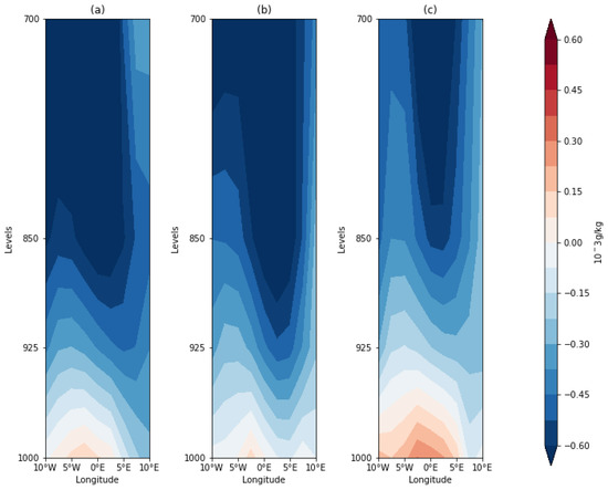 Analogously to the vertical velocity analyses, composite altitude–longitude diagrams of specific humidity anomalies (in g·kg−1) are presented for the same periods (Figure 11). Prior to the MHW events (Figure 11, left), a weak excess of moisture (<0.15 g·kg−1) is observed at 1000 hPa along 5° W–0°. The weak excess of moisture is likely to vanish during the MHW occurrence phase (Figure 11, middle). This value ranges between 0 g·kg−1 and 0.075 g·kg−1 within the same longitudinal band. After the MHW events (Figure 11, right), the specific humidity increases strongly. That suggests an excess of moisture along 10° W–7° E. The specific humidity anomaly is particularly high in the lower layers (925–1000 hPa) along 5° W–5° E, which corresponds to the area of excess of evaporation observed with LH anomalies.