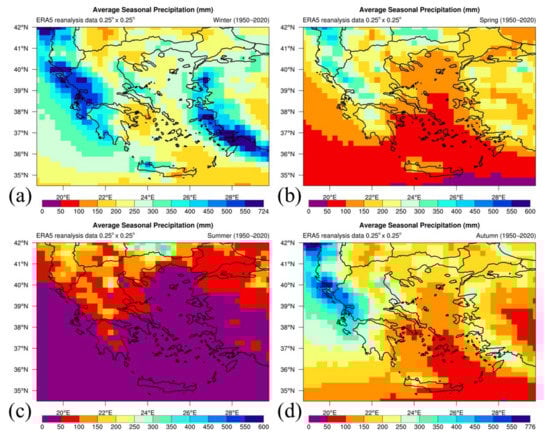 The spatial distribution of 71-year averaged annual and seasonal precipitation over the study area is presented in Figure 3 and Figure 4, respectively. The highest average annual precipitation values are depicted at western Greece with peaks over 1350 mm detected at Epirus and the Ionian Sea (Figure 3). There are some additional areas that are characterized by high precipitation values. These include the eastern Aegean Sea, western Peloponnese, northern Thessaly, eastern Macedonia, western Thrace, and western Crete. On the other hand, the lowest average annual precipitation values are demonstrated at eastern–southern Crete, and at the southeastern–southern–central Aegean Sea as well as at Athens and eastern Peloponnese (Figure 3). Precipitation values about 350–450 mm are illustrated at these areas, while values even lower than 350 mm can be detected at the southeastern Aegean Sea and southeast of Athens. The analysis of the 71-year ERA5 dataset conducted in this study generally corroborates previous studies. In particular, the spatial distribution of average annual precipitation over land areas of Greece agrees with the respective one presented in a map included in the classic book of Mariolopoulos and Karapiperis [52] for precipitation in Greece. It is also in agreement with the respective distribution demonstrated in the climatic atlas of Greece of the Hellenic National Meteorological Service [53,54]. The spatial distribution of annual precipitation is mostly determined by the mountains and the passage of barometric depressions accompanied by fronts, mainly occurring during the cold period. In general, the barometric systems move in a west-to-east direction bringing larger water amounts over the windward slopes of mountains in comparison to the leeward ones (Figure 1 and Figure 3), thus sufficiently explaining local variations of precipitation across Greece [9]. It is noteworthy that Pindus Mountain range (Figure 1) is a typical example as it plays a key role on the formation of a wetter climate over the western continental Greece in comparison with the drier climatic conditions that prevail over the eastern continental Greece.