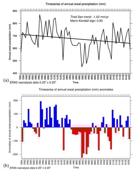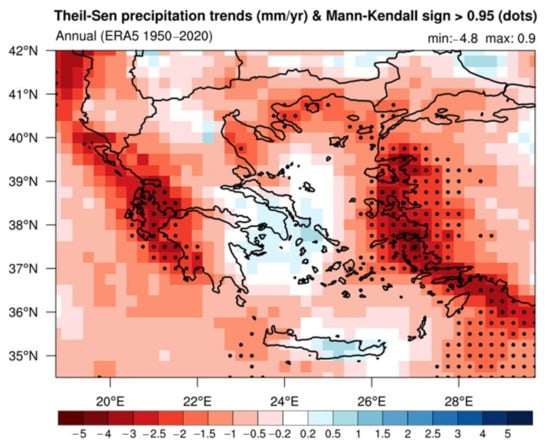 Afterwards, we estimated Theil–Sen linear trends [39,40] for each ERA5 grid point in the study area, considering the 71-year period from 1950 to 2020. The Theil–Sen trend estimation method is one of the most popular nonparametric techniques for estimating a linear trend. It is insensitive to outliers, and it can be better than simple linear regression for skewed and heteroskedastic datasets, competing also well against nonrobust least squares even for normally distributed data in terms of statistical power. To estimate Theil–Sen trends, we used annual precipitation values for each point considering the 71 years. We used annual precipitation values instead of monthly ones to make deseasonalized time series. In this way, we avoided probable errors in our estimations related with seasonal variability of precipitation within each year. We also applied Mann–Kendall (M–K) nonparametric tests for monotonic trends [41,42,43] to check the significance of the 71-year trends for each point. The M–K test is distribution-free and is used to detect the presence of both linear and nonlinear trends in time series assessing if they are steadily increasing/decreasing or are unchanging. Consequently, we estimated Theil–Sen linear trends and M–K significance considering time series of annual precipitation spatially averaged over the study area (annual areal precipitation hereafter). The annual areal precipitation is translated to the average water amount expressed in mm that drops across the entire study area each year and was calculated as the arithmetic mean of the 1395 annual precipitation amounts from the respective grid points covering the study area. The estimation of Theil–Sen trends and M–K test was based on the respective functions of NCL (National Center for Atmospheric Research-NCAR Command Language [44,45]).
