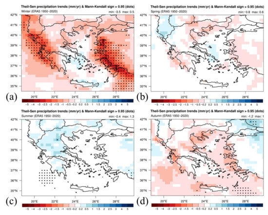 It is obvious that annual precipitation trends are determined by winter (DJF) that demonstrates a similar pattern at the eastern Aegean Sea and western Greece (Figure 6a). Additionally, more grid points with significant trends at the Ionian Sea are presented for winter (Figure 6a). In spring (MAM) and summer (JJA), there are few points characterized by significant trends either unchanging or declining (Figure 6b,c). In autumn (SON), there are more points with significant trends compared with spring and summer but fewer than winter and limited at the southeastern Aegean Sea (Figure 6d). Therefore, winter seems to mostly determine the inter-annual trends of precipitation. The analysis resulted in declining trends of precipitation during the past 7 decades that are more pronounced over the wettest areas of Greece (i.e., western Greece and the eastern Aegean Sea as illustrated in Figure 3). This finding could be considered encouraging because these areas are not as vulnerable to drought as some drier Greek areas such as the region around Athens, the eastern Peloponnese, and eastern Crete. Nevertheless, the reduction of precipitation even at the wettest areas might have significant implications for ecosystems, agriculture, the economy, and society.