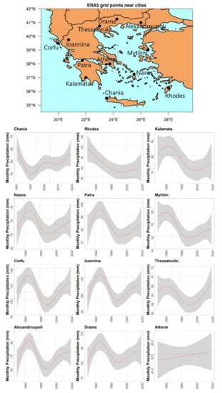 Fitted GAM trends to monthly precipitation (mm) for 12 selected grid points near Greek cities. Note that the 12 illustrated points are not exactly at the locations of cities. City names are used for convenience. The diagrams have different y-axis scale to better present the temporal variabilities of precipitation for each location. The shaded area represents the 95% confidence intervals. GAM results for the 11 of 12 cities illustrated are significant (p ≤ 0.05), except for Athens in the last diagram.