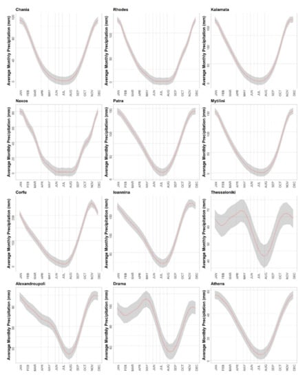 Regarding intra-annual variations, the majority of selected locations are characterized by a typical seasonal distribution, following alternations illustrated in Figure 9. Most of the areas have a dry summer (adding also late spring and early autumn), wet winter (adding also late autumn and early spring) and two transitional seasons, including sub-periods of autumn and spring. This distribution strongly depends on cyclonic and frontal activity at this area [9]. It is noteworthy that Drama, Thessaloniki and Alexandroupoli, which are cities in northern Greece, additionally present high precipitation amounts in late spring and early summer. These are explained by the frequent occurrence of convective storms there during this period.