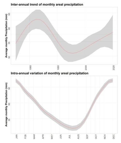 Fitted GAM inter-annual trend and intra-annual variation to monthly areal precipitation (mm) over the study area. The shaded area represents the 95% confidence intervals.