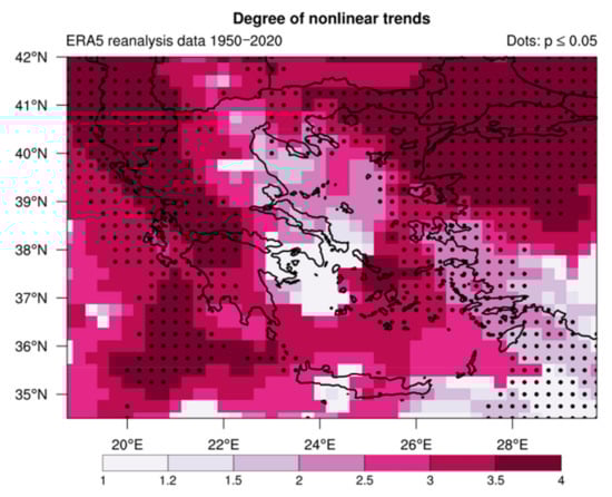 We also quantified the degree of nonlinear trends by using the effective degrees of freedom (edf), which reflects the nonlinearity of the fitted GAM curve [51]. Edf values close to 1 indicate a linear trend, whereas higher values show more complex and nonlinear trends. Figure 11 depicts the spatial distribution of significant (p ≤ 0.05) and nonlinear trends showing that areas of Western Greece, and the Ionian and Eastern Aegean are more likely to show significant and nonlinear trends (edf > 2.5). These findings agree with the results from the Theil–Sen trend analysis (Figure 5), although the analysis with GAMs revealed a notably higher number of cells with significant trends. This is attributed to the advantage of GAMs to better fit the data and deal with nonlinear trends.