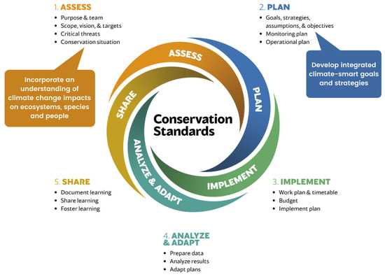 The climate-smart guidance presented here is based on the already widely-used [19,20,21] “Open Standards for the Practice of Conservation” (hereafter: The Conservation Standards). As an application of systems thinking [22] and adaptive management, the Conservation Standards have been successfully applied to thousands of conservation projects over the last decade. The Conservation Standards provide a user-friendly, evidence-based, and consistent approach to the design, management, monitoring, and adaptation of conservation projects. They represent a leading adaptive management framework in the fields of biodiversity conservation and ecosystem management [23,24].