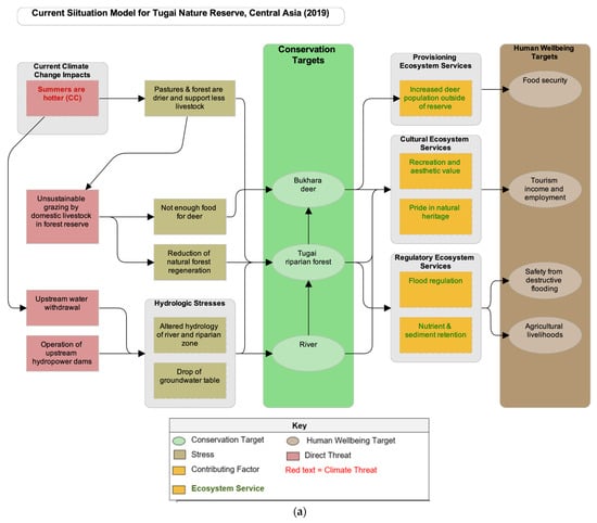 The situation model is intended to not only visualize how climate change may affect priority ecosystems and species but also (where appropriate) show feedback loops—illustrating how ecosystems degraded by projected climate impacts will be less able to sustain current (unsustainable) resource uses. In the Tugai Nature Reserve (see Figure 5a), for example, in the future extreme heat events and drought may cause a die-off of the Tugai forest, while unsustainable grazing is likely to reduce natural forest regeneration. Both of these impacts are likely to reduce the capacity of the forest to sustain current levels of grazing.