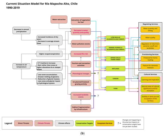 For the Río Mapocho Alto in Chile, planners modified the current situational model to reflect the future situation, drawing on information from the scientific literature, interviews with local stakeholders, communication with various experts, and results from models of potential changes in the suitable climate niche for target species. These sources of information suggest that changes in precipitation, increases in air temperature, and the melting of snow and glaciers could result in considerable changes in the availability and quality of freshwater resources, the risk of landslides, the location and amount of suitable climate and other critical resources for target species and ecosystems, and other interactions with non-climate threats such as invasive species, wildfire, and unplanned livestock grazing (Figure 4 and Figure 5b).