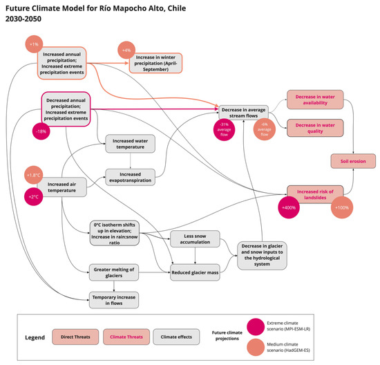 For the Río Mapocho Alto watershed in Chile, planners examined projections from two different climate models when developing a conceptual diagram that depicted the expected changes in climate-related variables (Figure 4). One of the climate models was considered to be a relatively moderate future climate scenario (+1.8 °C and +1% annual precipitation), whereas the second model projected more extreme changes in temperature and precipitation (+2 °C and −18% annual precipitation). Both of these climate scenarios are projected to result in decreased runoff and surface water availability, especially when combined with decreased glacial and snow inputs to the hydrological system (Figure 4).