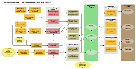 In our Central Asian project example, the key attributes of the Tugai forest that the team wants to maintain or enhance include the size of the forest, the regeneration of Populus pruinosa saplings, and the intensity of seasonal flooding. The future situation model helped the team recognize that more frequent and severe heat events and drought will exacerbate the effect of unsustainable grazing practices on forest regeneration and grazing must be managed (or possibly prohibited) if the team is to meet their goal for Tugai forest: