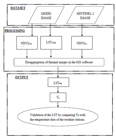 We would underline the application of Equation (7), within this study, gives rise to atmospheric temperatures lower than the LST at midday and higher at night, as expected. Finally, a preliminary assessment on the reliability of the application of Equation (7) in the investigated area is presented. Figure 2 represents the flowchart of the proposed methodology, showing the datasets used, the processing stage and the output.