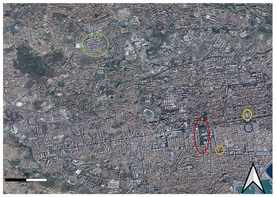 Ortophoto of Catania city, red circle highlights Villa Bellini, yellow circle the courthouse, blue circle the skyscraper, orange circle Stesicoro square and green circle is San Nullo district.