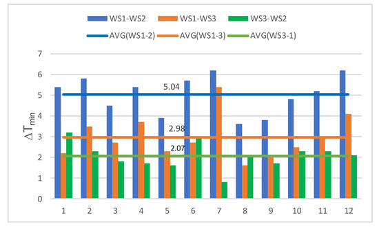 To highlight the variation in the minimum temperature at the different weather stations, we performed differences per pair of stations, i.e., WS1–WS2, WS1–WS3 and WS3–WS2, as shown in Figure 4. The minimum temperatures observed at WS1 are 2–6 °C higher than the other two WSs. The average temperature difference (∆Tu-r) between WS1 and WS2 results 5.04 °C with a standard deviation of 0.92 °C, while ΔTu-r between WS1 and WS3 gives rise to 2.98 °C with a standard deviation of 1.1 °C. These values highlight the increase of the air temperature moving from the city centre to the far surroundings, where the WS2 is placed. In light of the above analysis, the differences between daily Tmin measured by the urban weather station WS1, and those measured by the WS1 and WS3 weather stations, could provide preliminary evidence for the heat island intensity