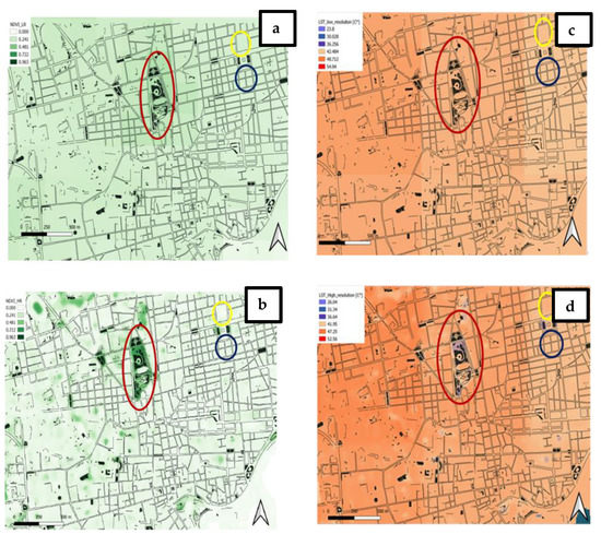 NDVI250 (a), NDVI10 (b), LST at low (c) and high resolution (d) on 14 July 2017. The red circle highlights Villa Bellini, the yellow circle the courthouse and the blue circle the skyscraper.