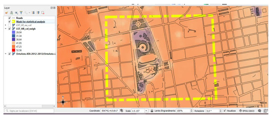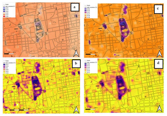 To further point out the helpfulness of the proposed procedure for obtaining more detailed evaluations on the urban climate, the zonal-statistics raster QGIS tool was applied to the sample area indicated by the yellow box of Figure 6. Within this sample area, the minimum (LSTmin), maximum (LSTmax) and average LST (LSTavg) temperature were determined. As the zone under investigation is represented by a single pixel, the LRES image (Figure 6) returns a single LST value for the entire area (44 °C). On the contrary, using the HRES image at 10 meters, the area can be better characterized. Indeed, using the statistical raster tool, we calculated the LSTmin, LSTmax and LSTavg that result 26.05, 44.92 and 44.39 °C, respectively. To highlight the difference in temperature between the day and nighttime period, we depicted the LST10 during two days, on 14 July and 26 August 2017 (Figure 7).