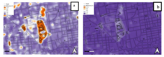 Daytime (a) and nighttime (b) LST differences on 26 August 2017.