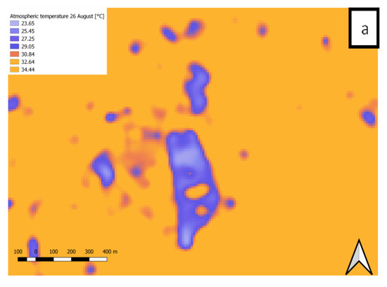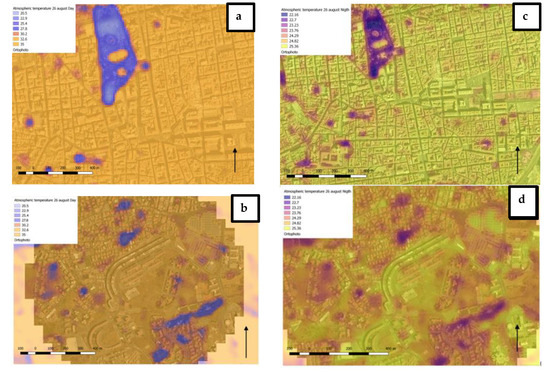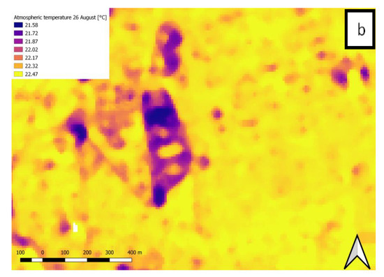 The variation of the atmospheric temperature in the central urban area of Catania during day and night is shown in Figure 9. The atmospheric temperature maps allow the identification of cooler areas (blue and purple colors), which coincide with green areas of the investigated region. It is also possible to observe as these cool areas are spread within the city. During the day (Figure 9a), the atmospheric temperature ranges from 23.65 to 34.44 °C, while during the night (Figure 9b), the variation is less evident, with the temperature going from 21.58 to 22.47 °C.
