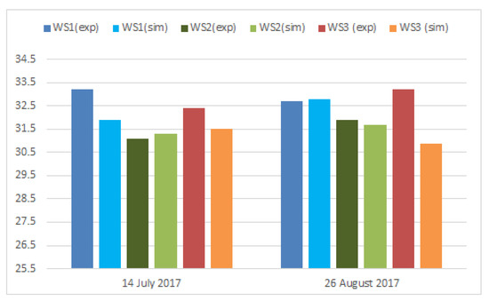 The analysis of the atmospheric temperature is in agreement with the air temperatures measured by the three weather stations and those determined by the proposed procedure in the same sites. Indeed, an average difference of 0.8 °C and a standard deviation of 0.5 °C is found between the observed (exp) and calculated (sim) atmospheric temperature (Tmax) at WS1, WS2 and WS3 on 14 July and 26 August 2017 (Figure 10). The differences between the simulated and experimental data range from 0.1 to 1.29 °C for WS1 and from 0.89 to 2.31 °C for WS3, while the lowest difference was observed at the position of WS2, being 0.18 and 0.24 °C on 7 July and 26 August, respectively.
