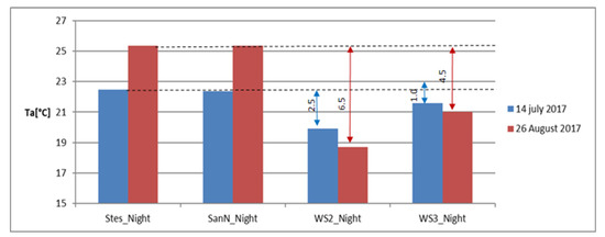 For the Stesicoro Square (SteS), ΔTu-r was determined by the differences between Tmin and Tmin in the suburban area of WS2 and the rural area of WS3. In the same way, ΔTu-r for San Nullo (SanN) was determined by the differences between Tmin at San Nullo and Tmin at WS2 and WS3. The atmospheric temperatures at the four locations SteS, SanN, WS2 and WS3 during the nighttime are reported in Figure 13. The two urban districts SteS and SanN have similar atmospheric temperatures for both days, which are about 22.5 °C on 14 July and 25.5 °C on 26 August, while the suburban area, WS2, and the rural area WS3, have meaningful differences. WS2 has a temperature of about 19.9 °C on 14 July and 18.7 °C on 26 August; WS3 has a temperature of about 21 °C on 14 July and 21.6 °C on 26 August.