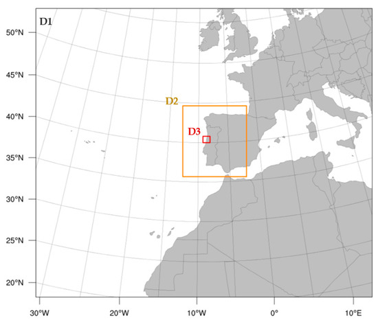 For this study, the model setup includes three nested domains, run in two-way mode, covering a large part of Europe and North Africa (D1, background domain), through a regional domain centred over Portugal (D2) to a Portuguese region (D3, inner domain) with horizontal grid resolutions of 25, 5, and 1 km, respectively (Figure 1). However, since the urban scale is the focus of this research, only NO2 results from domains 2 and 3 were analysed and compared. To solve the vertical structure of the atmosphere, 29 vertical levels extending up to 50 hPa were considered, with the lowest level at approximately 28 m above the surface.