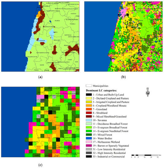 Methodologically, this new LC database was developed and implemented within the WRF-Chem as follows: (i) CLC and national LC data were integrated in GIS (geographic information systems) software and reclassified according to the new 33-classes USGS nomenclature following those previously suggested [34]; (ii) in the LC reclassification process, the inclusion of three different urban classes: low-intensity residential (class 31), high-intensity residential (class 32), and industrial or commercial (class 33) should be highlighted; and (iii) lastly, the resulting LC was processed to be directly ingested by the model considering 5000 and 100 m horizontal resolutions for CLC areas and Portugal, respectively.