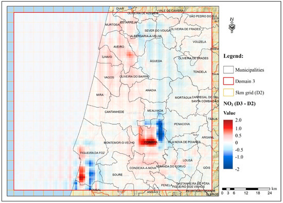 Looking at the spatial pattern of annual mean NO2 differences, the influence of the LC interpolation process under the simulation grids has a large impact, since the highest resolution from domain 3 solves the geographic location of the LC categories better and, consequently, an improved representation of the main emission sources and amount of emitted pollutant is expected. Hence, higher positive differences of NO2 concentrations (up to 2 µg·m−3) in pollution hotspots were found, which, to a certain extent of domain 2, are not properly captured, or even not identified. For the Aveiro and Figueira da Foz municipalities, more pronounced positive differences occur near the large industrial point sources, whereas for Coimbra, the resulting LC characterisation and associated road activity were the reason for raising the NO2 concentrations over domain 3. Supporting this information, Figure 4 shows the dominant LC categories for the D3 cells, where those identified as urban, mainly the categories 32 and 33 (high-intensity residential and industrial or commercial, respectively), contributed to higher NO2 values in relation to the D2 estimates. In contrast, for the surrounding area of these hotspots, higher concentrations were estimated for domain 2 (negative differences in Figure 3), probably due to the way the emissions were spatially distributed by the simulation grids, attributing a more uniform pattern to D2.