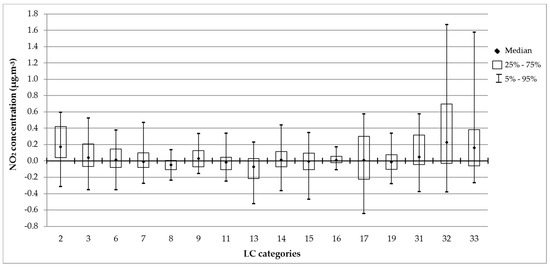 Annual mean NO2 differences (µg·m−3) between D3 and D2 grouped by dominant LC category. For the legend of LC categories, see Figure 2.