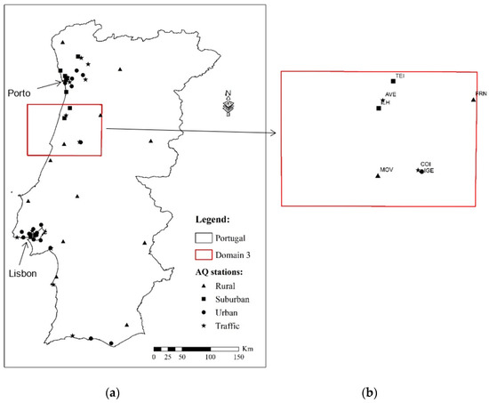 (a) Portuguese air quality monitoring network and (b) common stations to both simulation domains (D2 and D3) used for model validation.